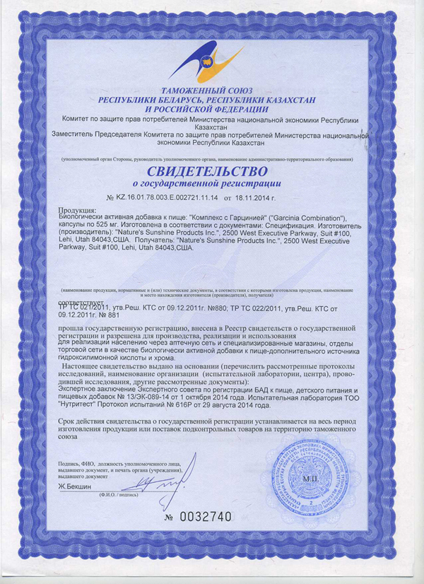 Беларусь, Россия, Армения, Казахстан, Грузия, Монголия Состав «Комплекс с Гарцинией»: 1 капсула содержит: экстракт плодов гарцинии (Garcinia cambogia) — 285 мг; звездчатка средняя, надземные части (Stellaria media) — 100,65 мг; L-карнитин — 23,6 мг (7,9% от АСП); хром (в аминокислотном хелате) — 30 мкг (60% от АСП). Вспомогательные вещества: стеарат магния, диоксид кремния, желатин. Применение «Комплекс с Гарцинией»: Взрослым по 2 капсулы 3 раза в день за 30 минут до еды. Продолжительность приема 1 месяц. Противопоказания «Комплекс с Гарцинией»: индивидуальная непереносимость компонентов продукта, беременность, кормление грудью. Украина, Молдова Состав «Garcinia Combination»: 1 капсула — Экстракт из плодов гарцинии (Garcinia cambogia)- 285 мг, Звездчатка (Stellaria media)- 100 мг. Вспомогательные вещества: L-карнитин, стеарат магния (овощной), диоксид кремния, хелат хрома, желатин. Применение «Garcinia Combination»: в качестве биологически активной добавки к пище взрослым принимать по 1 — 2 капсулы 3 раза в день за 30 минут до еды. Противопоказания «Garcinia Combination»: индивидуальная непереносимость компонентов продукта. США Ingredients Garcinia Combination: 60 mcg chromium (50% of the Daily Value), garcinia fruit rind extract, chickweed aerial parts, l-carnitine. Recommended Use Garcinia Combination: Take 2 capsules 30 minutes before a meal three times daily. Доставка продукции осуществляется почтой, курьером до дверей или самовывозом (зависит от вашего региона). Оплата производится либо на сайте официального интернет-магазина компании, либо непосредственно при получении товара наличными деньгами в национальной валюте по курсу доллара на момент покупки. Для этого у вас есть возможность оформить дисконтный номер НСП (если его нет) и получить подробную информацию о покупке продукта в вашем регионе. Похудение. Мой личный результат Правильное похудение от диетолога Стейси БеллКомплекс с Гарцинией (Garcinia Combination)