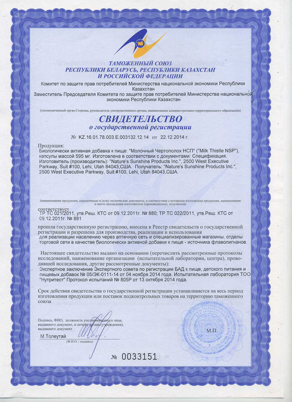 Беларусь, Россия, Армения, Казахстан, Грузия, Монголия, Украина, Молдова Состав «Молочный Чертополох НСП» 1 капсула содержит: молочный чертополох (Silybum marianum), семена — 320 мг; молочный чертополох (Silybum marianum), семена (экстракт) — 25 мг. Вспомогательные вещества: микрокристаллическая целлюлоза, стеарат магния, желатин. Применение «Молочный Чертополох НСП»: Взрослым принимать по 1 капсуле в день с приемом пищи в течение 1 месяца. При необходимости прием можно повторить. Противопоказания «Молочный Чертополох НСП»: индивидуальная непереносимость, беременность, кормление грудью. США Ingredients Milk Thistle: Milk thistle seed extract (80 percent silymarin). Recommended Use Milk Thistle: Take 1 tablet with a meal twice daily. Канада Ingredients Milk Thistle: Medicinal Ingredients: Each tablet contains Silybum marianum (milk thistle) seed 230 mg of a 30:1 extract standardized to 184 mg silymarin. Non-medicinal Ingredients: Hydroxypropylcellulose; calcium phosphate, dibasic, anhydrous; microcrystalline cellulose; stearic acid; magnesium stearate. Recommended Use Milk Thistle: Dosage (adults): Take 1 tablet once daily. Use for a minimum of 3 weeks to see beneficial effects. Доставка продукции осуществляется почтой, курьером до дверей или самовывозом (зависит от вашего региона). Оплата производится либо на сайте официального интернет-магазина компании, либо непосредственно при получении товара наличными деньгами в национальной валюте по курсу доллара на момент покупки. Для этого у вас есть возможность оформить дисконтный номер НСП (если его нет) и получить подробную информацию о покупке продукта в вашем регионе. Дискинезия желчевыводящих путей (ДЖВП) Оздоровительная программа «Здоровье вашей печени» Молочный Чертополох НСП (Milk Thistle NSP)