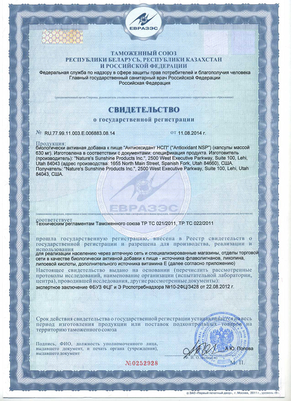 Беларусь, Россия, Армения, Казахстан, Грузия, Монголия БАД к пище Антиоксидант НСП является источником флаволигнанов, ликопина, липоевой кислоты, дополнительным источником витамина Е. Состав «Антиоксидант НСП»: 1 капсула содержит: корень куркумы (Curcuma longa) — 153,0 мг; смесь токотриенолов — 131,2 мг (5 мг витамина Е – 33% от АСП); плоды шиповника (Rosa canina) — 122,5 мг; семена молочного чертополоха (Silybum marianum) — 87,0 мг; альфа-липоевая кислота — 2,3 мг (7,7% от АСП); ликопин — 1,4 мг (28% от АСП) Вспомогательные вещества: стеарат магния, желатин, диоксид кремния. Применение «Антиоксидант НСП»: взрослым принимать по 1 капсуле 2 раза в день во время еды в течение 3-4 недель. Противопоказания «Антиоксидант НСП»: индивидуальная непереносимость компонентов продукта, беременность, кормление грудью. Украина, Молдова Состав «Super Antioxidant»: Состав — 1 капсула: Применение «Super Antioxidant»: в качестве БАД взрослым — по 1 капсуле 1-2 раза в день во время еды. Противопоказания «Super Antioxidant»: не рекомендуется принимать беременным и кормящим женщинам, при индивидуальной непереносимости компонентов продукта. США Super Antioxidant is an exclusive formulation of several powerful antioxidants that help neutralize damaging free radicals inside the body and maintain the structure and integrity of cellular makeup. This formula combines tocotrienols (scavenge free radicals within circulating lipoproteins), lycopene (a carotenoid antioxidant) and alpha lipoic acid (is both fat- and water-soluble to provide antioxidant protection throughout the body) in a base of rose hips fruit (a natural source of vitamin C, carotenoids and flavonoids), milk thistle seed (protects liver from toxins) and turmeric root (protects liver tissue). Turmeric root, tocotrienols, rose hips fruit, milk thistle seed, lycopene and alpha lipoic acid. Take 1 capsule with a meal twice daily. Доставка продукции осуществляется почтой, курьером до дверей или самовывозом (зависит от вашего региона). Оплата производится либо на сайте официального интернет-магазина компании, либо непосредственно при получении товара наличными деньгами в национальной валюте по курсу доллара на момент покупки. Для этого у вас есть возможность оформить дисконтный номер НСП (если его нет) и получить подробную информацию о покупке продукта в вашем регионе. Антиэйджинг — эффект антиоксидантов Продукты НСП против старения организма Антиоксидантные системы организма Антиоксидант НСП (Antioxidant NSP)
